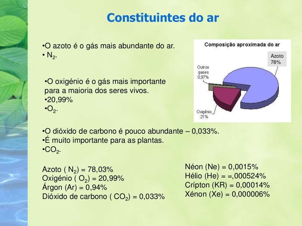Embora frequentemente associado a impactos ambientais negativos, o dióxido de carbono (CO₂) é um componente essencial do ar, desempenhando um papel crucial na fotossíntese. As plantas, algas e certas bactérias utilizam o CO₂ atmosférico, juntamente com a luz solar e água, para produzir glicose e outros compostos orgânicos, liberando oxigênio como subproduto. Este processo não só sustenta a vida vegetal, mas também é a base da cadeia alimentar, fornecendo alimento e energia para os organismos heterotróficos.