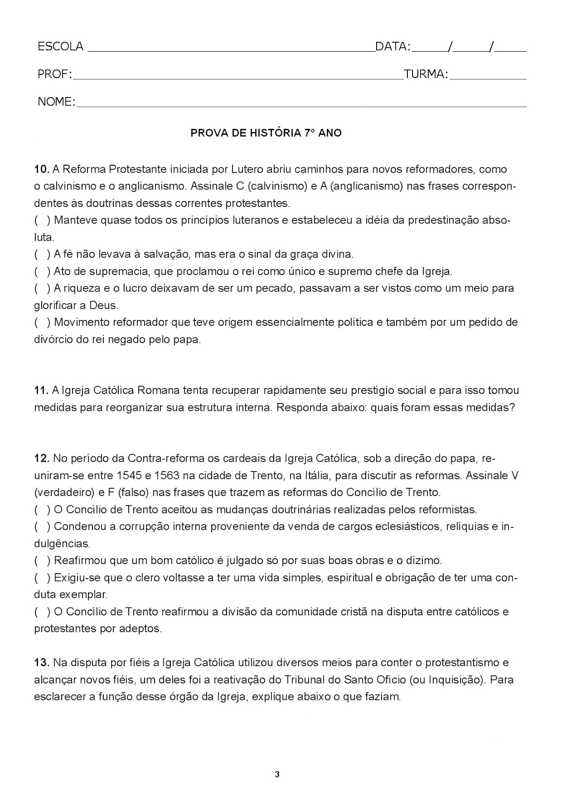 Exercicios Sobre Reforma Protestante 7 Ano Com Gabarito