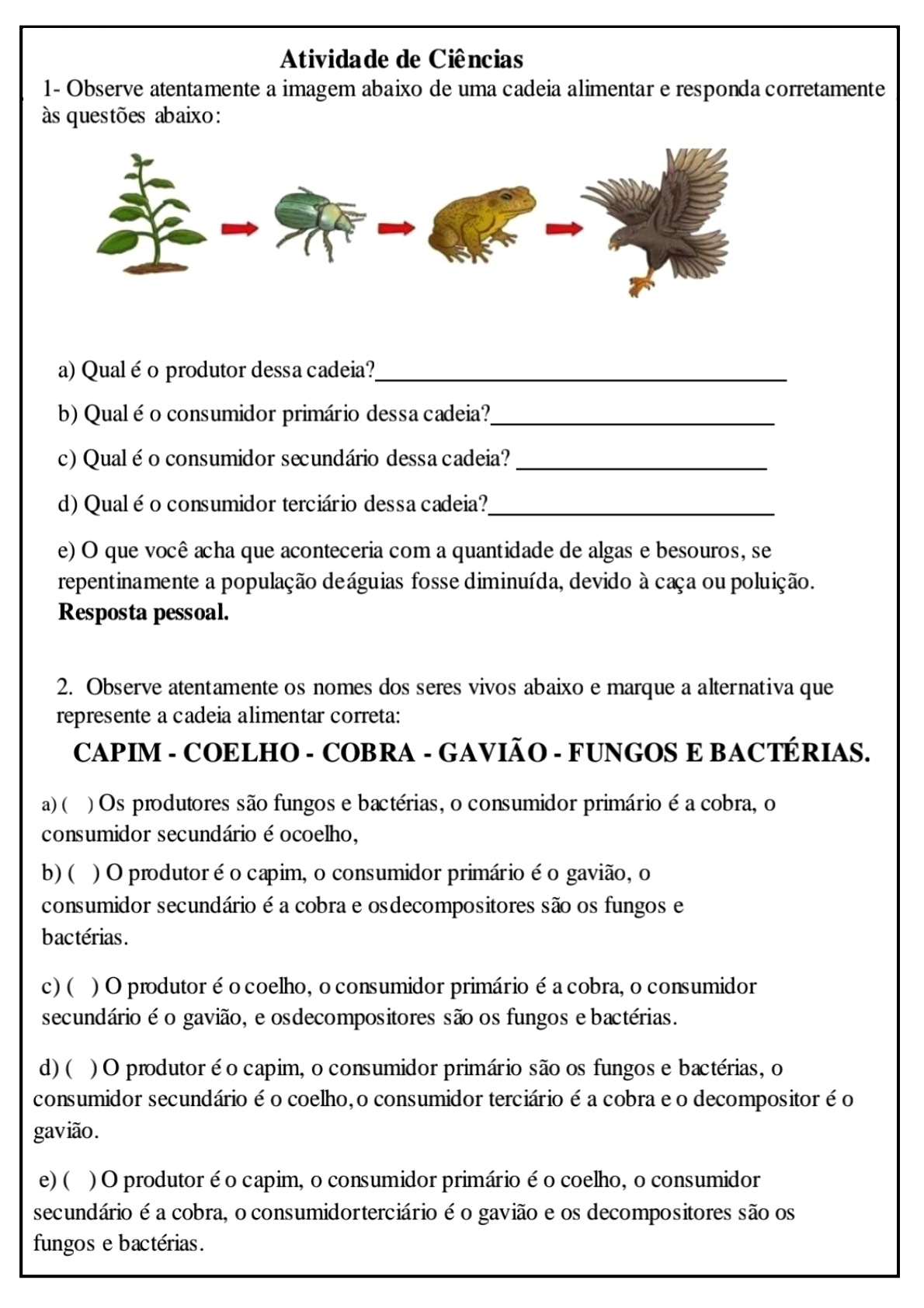 Exercícios Cadeia Alimentar 4o Ano - EDUCA